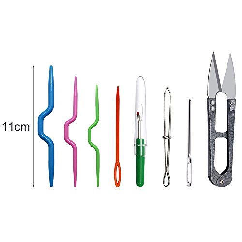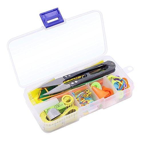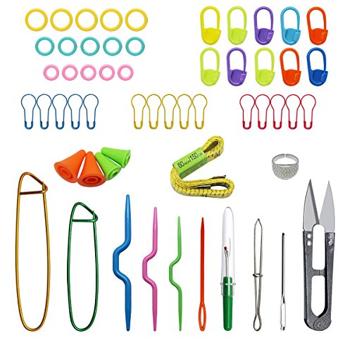 - All Basic Knitting Tools Needed -- Thread clip * 1, Seam ripper * 1, Tape measure * 1, Thimbles * 1, Needles point protectors * 4, Stitch holder * 2, Crooked needle * 3, Locking stitch markers * 10, Split ring markers * 15, Safty pin * 5, Large-eye blunt needle * 1