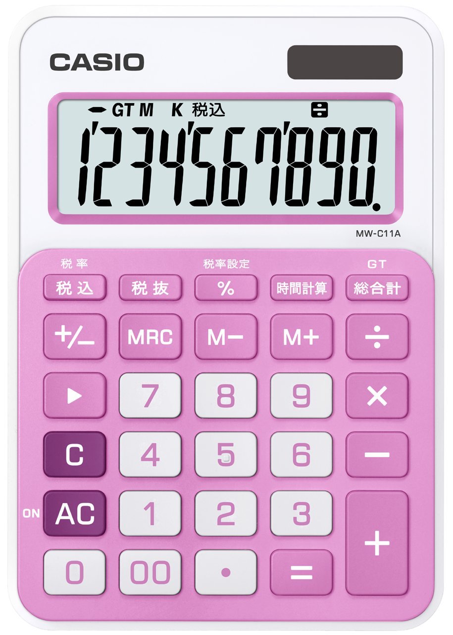 色:ベイビーピンク ●桁数: 10 ●メモリー:2 ●電源種類:T・W・P(太陽電池と補助電池の併用)(LR44) ●電池数:1 ●電池寿命:約3年 ●大きさ(奥行×幅×高さ mm):149.5×104.5×22.1 ●質量(g):125 機能:税計算,計算状態表示,時間計算,マルチ%,四則定数計算,概数計算,桁下げ(シフト),+/-(サインチェンジ),キーロールオーバー機能(早打ち機能),ツーゼロキー