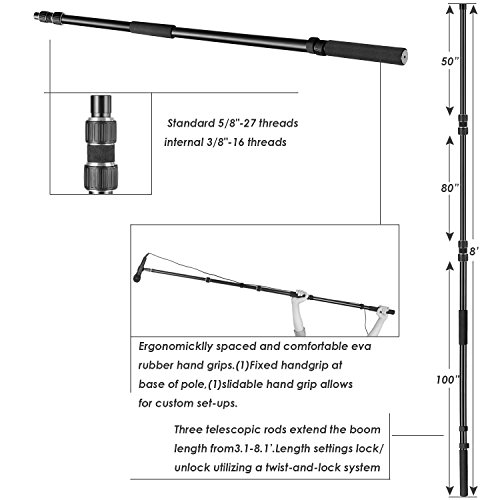 -. Binding : Electronics -. Brand : Neewer -. EAN : 0191073001633 -. Feature : Standard 5/8"-27 threads with solid brass male end and internal 3/8"-16 threads. / Ergonomically spaced and comfortable EVA rubber hand grips. (1) Fixed handgrip at base of pole, (1) sliding hand grip allows for custom set-ups. / Three telescopic rods extend the boom length from 3.1-8.1'. Length settings lock/unlock utilizing a twist-and-lock system. / Made out of aluminum alloy, it is lightweight and reduces operator fatigue associated with longer shoots. / Note: Microphone is not included -. IsAutographed : 0 -. IsMemorabilia : 0 -. Label : Neewer® -. Manufacturer : Neewer® -. Model : 10088311 -. MPN : 10088311 -. PackageQuantity : 1 -. PartNumber : 10088311 -. ProductGroup : Musical Instruments -. ProductTypeName : CAMERA_OTHER_ACCESSORIES -. Publisher : Neewer® -. Studio : Neewer® -. Title : Neewer Portable 3 Sections Stretchable Handheld Microphone Boom Pole with Standard 5/8 inch-27 Threads and Adjustable Length from 3 feet to 8 feet (NW-7000) -. UPC : 191073001633