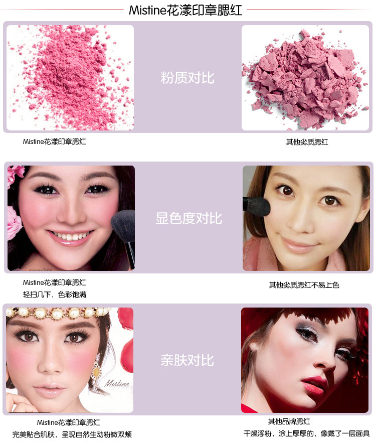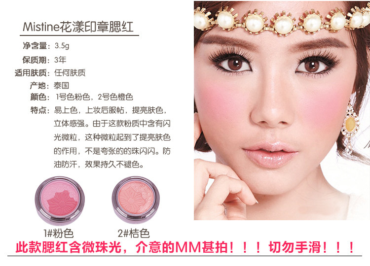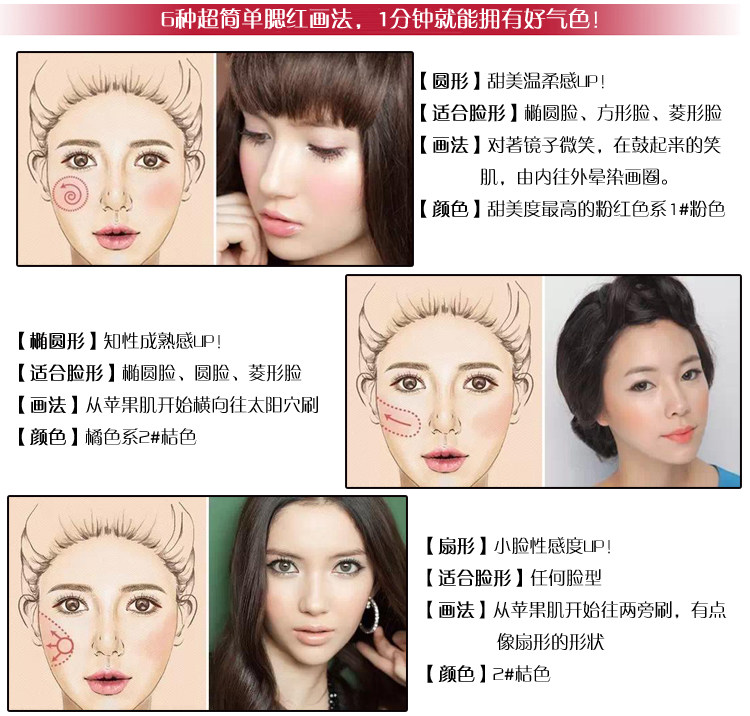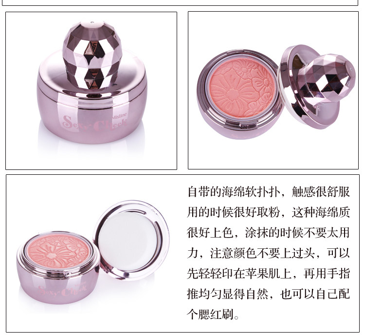 使用方法:打开后背面有个白色的海绵就等于平时我们的腮红刷哦。轻轻扫一点在苹果肌上就可以了。这个产品设计的很好也方便。为我们女孩子出门省下一道功夫啊。出门只需要带它出去就好了。腮红刷可以躺在家里了。