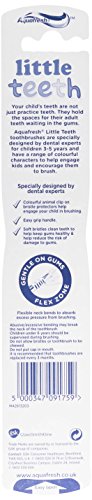 -. Binding : Grocery -. Brand : Aquafresh -. EAN : 5000347091759 -. Feature : Curt the Croc colourful animal clip-on bristle protectors help engage your child in brushing / Easy grip handle to help you brush / Soft bristles clean teeth to help keep gums healthy / A flexible neck that bends to absorb pressure from brushing to help reduce the risk of damage to gums / Recommended for 3 to 5 years age -. IsAdultProduct : 0 -. Label : dabba_london1 -. Manufacturer : dabba_london1 -. Model : 60000000014152 -. PackageQuantity : 1 -. ProductGroup : Beauty -. ProductTypeName : GROCERY -. Publisher : dabba_london1 -. Studio : dabba_london1 -. Title : Aquafresh Little Teeth Toothbrush