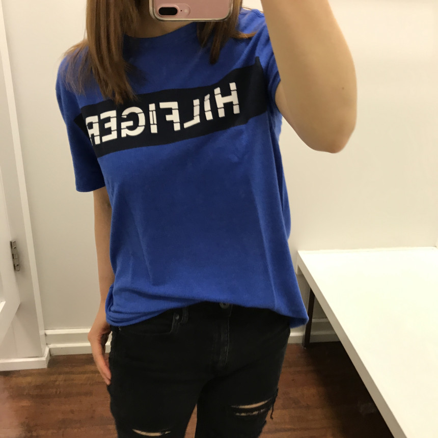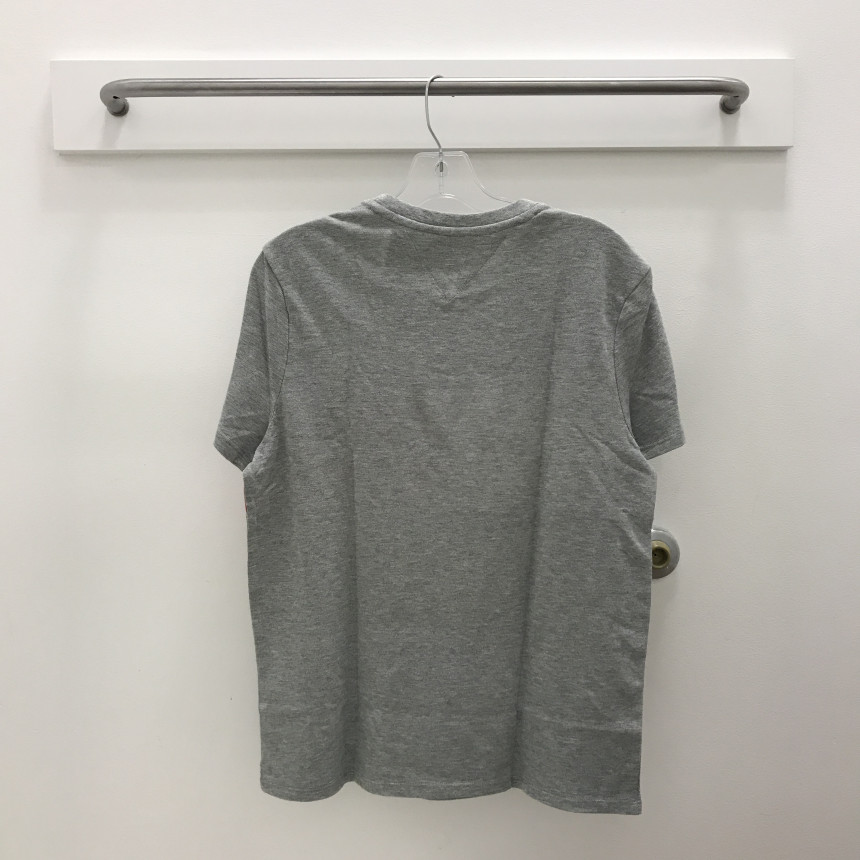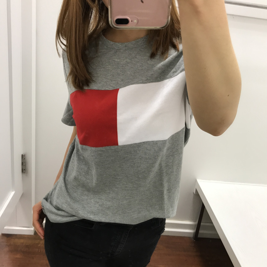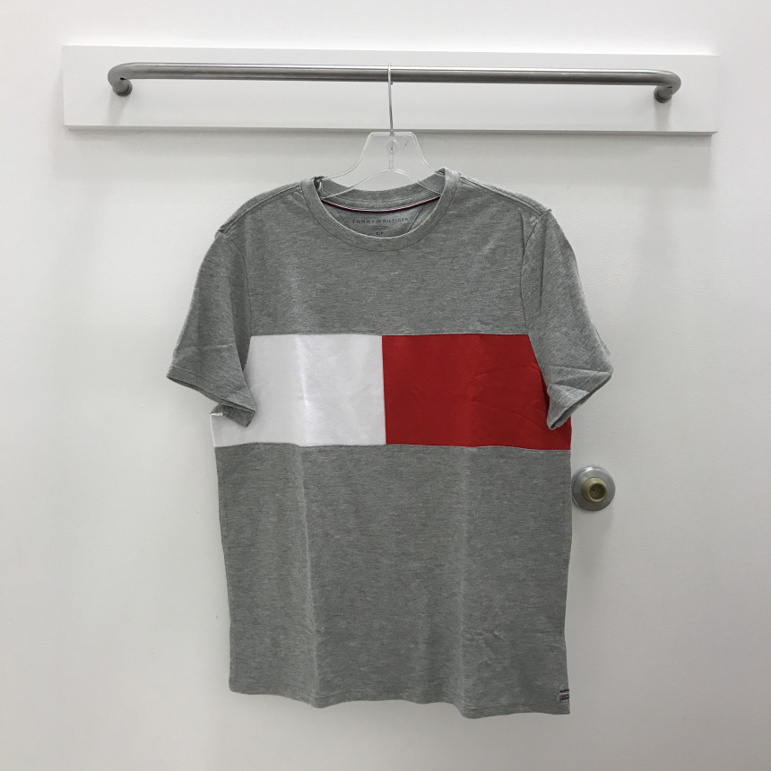 グレーTシャツにトミーヒルフィガーシグネチャが