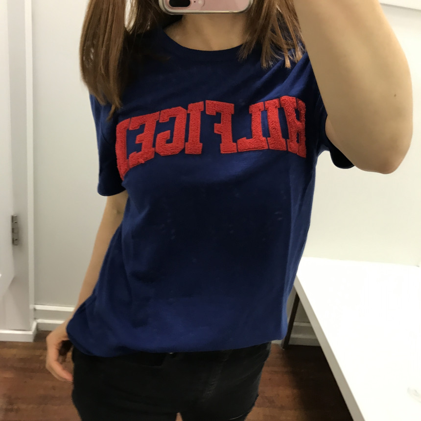 ネイビーTシャツにレッドレタリングが