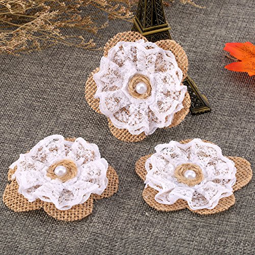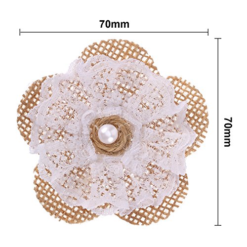 Material: this flower is made up with burlap fabric, white lace and pearl bead, exquisite workmanship, elegant and beautiful; Each burlap flower size about 70 mm in diameter