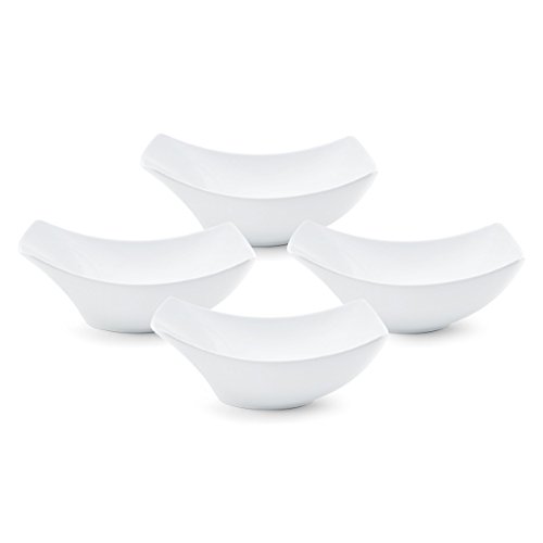 This set of 4 White Rectangular Serving Bowls from Gourmet Basics by MIkasa is the ultimate in modern dinnerware design and sets a tone of elegant sophistication at all your dinner gatherings. These rectangular bowls are made of pure white porcelain with unique curved sides that cradle soups and salads, making for an incredibly appetizing presentation on your table. Each bowl measures 9-1/4 Inch long x 7 Inch wide x 3-3/4 Inch high. Set of 4. Microwave and dishwasher safe.Feature