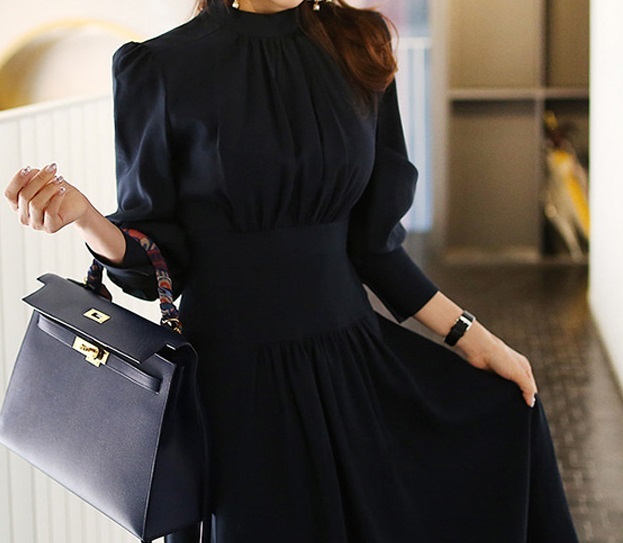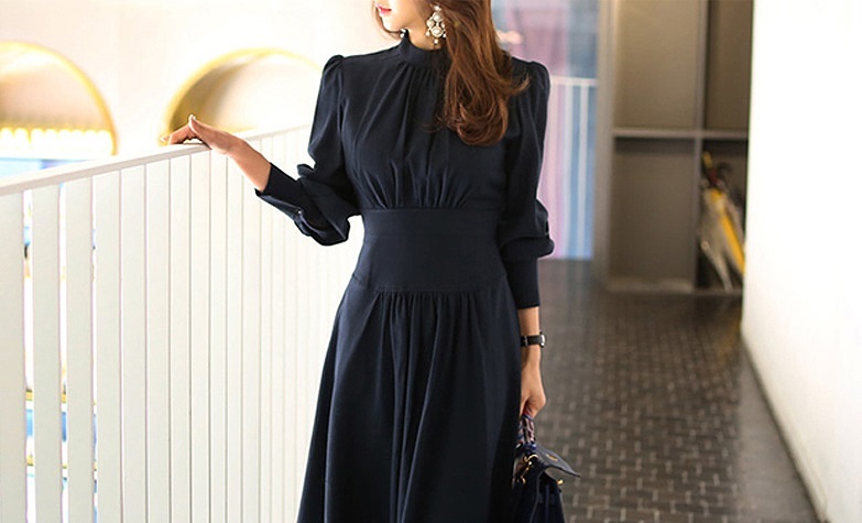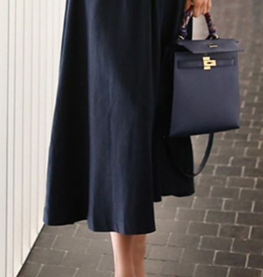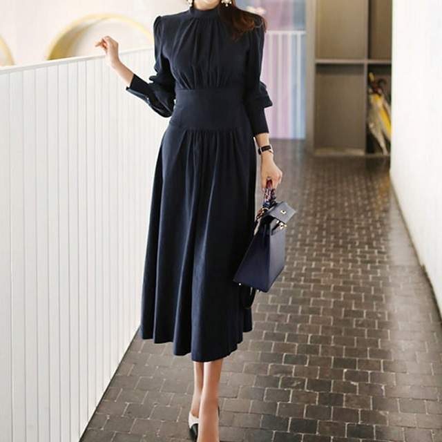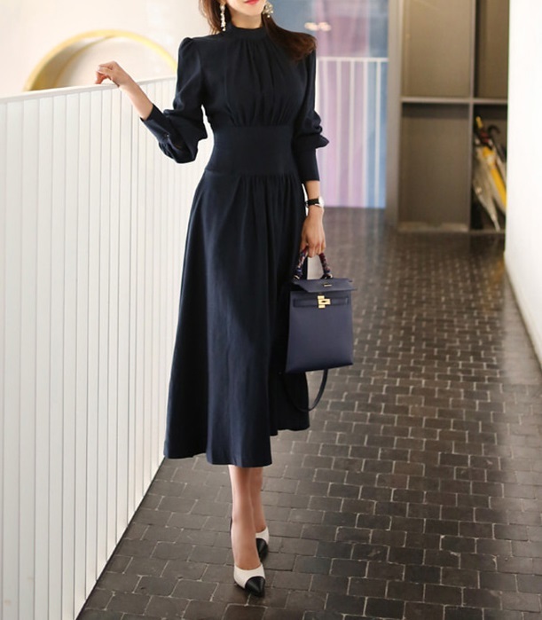 落ち着いたネイビーカラーで上品な着こなしへとアシストするミモレ丈ワンピースです♪