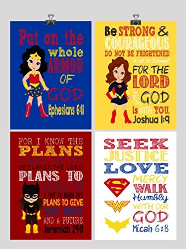 -. Title : Superhero Set of 4 - Christian Wall Art Print - Supergirl, Batgirl, Wonder Woman - Bible Verse Nursery, Playroom or Kids Room Decor - Multiple Sizes