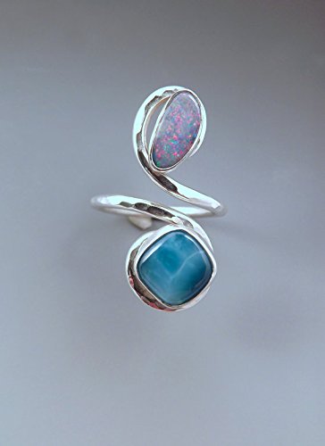 -. Title : Opal and Larimar- Brilliant Multi Color Fire- Soothing Azure Blue- Hammered Sterling Silver Swirl- Adjustable Size Ring