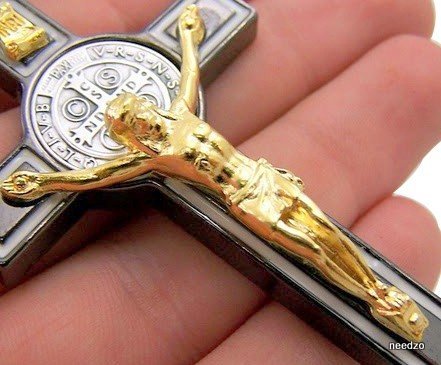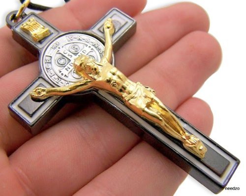 -. Title : Black Enamel Gold Tone Saint Benedict Icon Cross Crucifix Pendant, 3 Inch