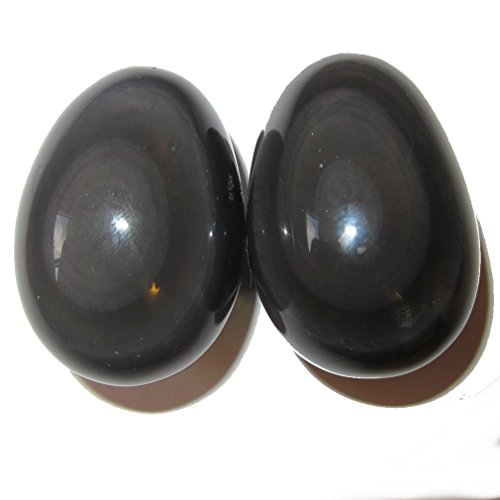 Your attractive egg pair is made from rainbow obsidian gemstone. Obsidian is formed from volcanic activity. It appears black in normal lighting, but under intense light you will see various rainbow patterns. Super shiny and polished, it has some lines, rings, and white pores along the surface that are characteristic of genuine obsidian. Receive this exact stone pictured when you order from Satin Crystals.