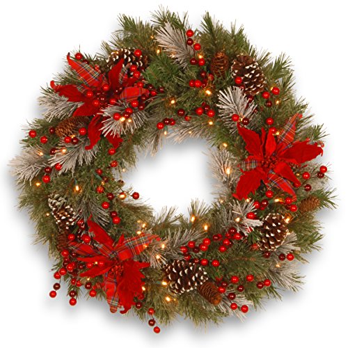 National Tree 24 Inch Decorative Collection Tartan Plaid Wreath with Cones, Red Berries, Poinsettias and 50 Battery Operated Soft White LED Lights with Timer (DC13-147-24WB-1)