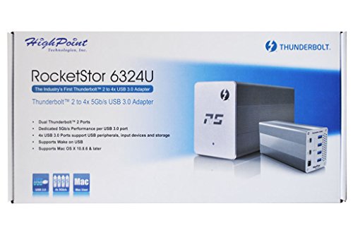 -. Binding : Personal Computers -. Brand : High Point -. EAN : 0643653632428 -. Feature : Industry's 1st Thunderbolt 2 to 4x USB 3.0 Adapter / Dual Thunderbolt 2 Ports / Dedicated 5Gb/s Performance per USB 3.0 port / 4x USB 3.0 Ports support USB peripherals, input devices, hubs and storage / Supports Wake on USB / Supports Mac OS X 10.8.6 & later -. HardwarePlatform : PC;Mac -. Label : HighPoint -. Manufacturer : HighPoint -. Model : RocketStor 6324U -. MPN : RocketStor 6324U -. PackageQuantity : 1 -. PartNumber : RocketStor 6324U -. ProductGroup : Personal Computer -. ProductTypeName : COMPUTER_ADD_ON -. Publisher : HighPoint -. Studio : HighPoint -. Title : HighPoint Thunderbolt 2 to 4x USB 3.0 Adapter (RocketStor 6324U) -. UPC : 643653632428 -. Warranty : Limited warranty period (parts): 1 year/limited warranty period (labor): 1 year/return for repair or replacement only