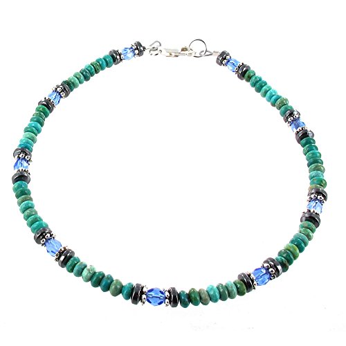 -. Title : Turquoise, Blue Glass, Hematite (Hemalyke) & Sterling Womens Beaded Gemstone Anklet with Daisies