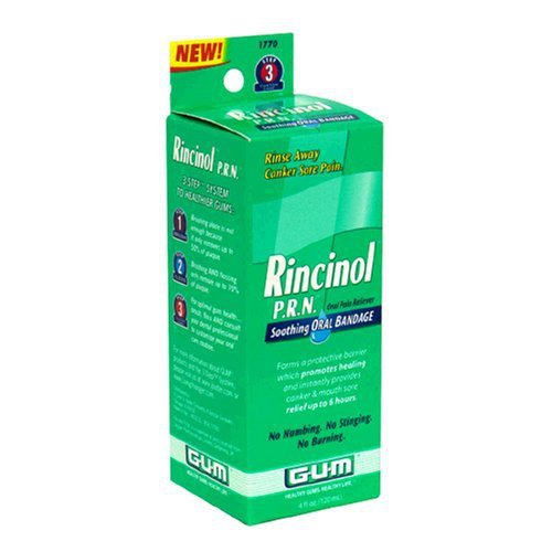 Step 3: Custom Care. Oral Pain Reliever. Forms a protective barrier which promotes healing and instantly provides canker & mouth sore relief up to 6 hours. Rinse away canker sore pain. No numbing. No stinging. No burning. Dosage cup provided. Dentist and Pharmacist recommended for pain caused by: Canker sores; Mouth sores; Denture irritation; Braces; Oral surgery. Introducing the pain-free way to relieve canker and mouth sore pain. No harsh hydrogen peroxide or painful benzocaine which means no numbing, stinging or burning. Rincinol P.R.N. gently forms a micro-thin, invisible, bioadhesive protective barrier over sores which promotes healing and prevents air, liquid, and food from irritating the sensitive nerve endings. This soothing oral bandage provides up to 6 hours of pain relief. No more messy gels. Simply swish Rincinol P.R.N. in your mouth and it will find the canker sores (or any sores), providing fast, effective pain relief. No more searching for the sores, Rincinol P.R.N. finds them for you. Safe for children. 3-Step System to Healthier Gums: Step 1 (Brush) - Brushing alone is not enough because it only removes up to 50% of plaque; Step 2 (Floss) - Brushing and flossing only remove up to 70% of plaque; Step 3 (Custom Care) - For optimal gum health - brush, floss and consult your dental professional to customize your oral care routine.
