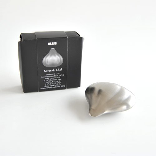 It is a useful object for the person, a handy addition to the Alessi Encyclopedia, this "Savon du Chef" was designed by the young Fred Gooris with the advice of Fabric Leclerc. Just rub the steel "soap" between your hands under cold running water for a few seconds and you'll have soft, odorless skin. "Savon du Chef" also acts as a nail-cleaner: the top part, smooth and not sharp, removes food residue without any risk of getting cut or of hurt.Feature