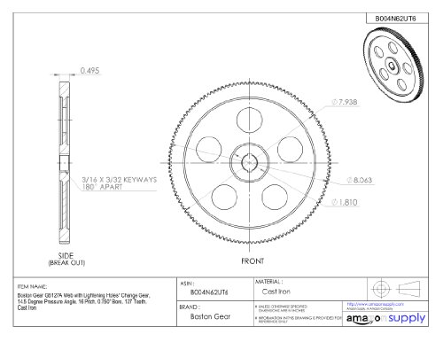 Boston Gear GB127A Web with Lightening Holes Change Gear, 14.5 Degree Pressure Angle, 16 Pitch, 0.750" Bore, 127 Teeth, Cast Iron
