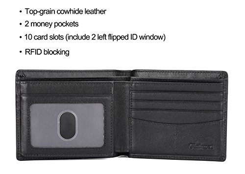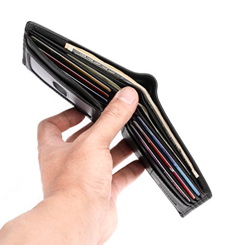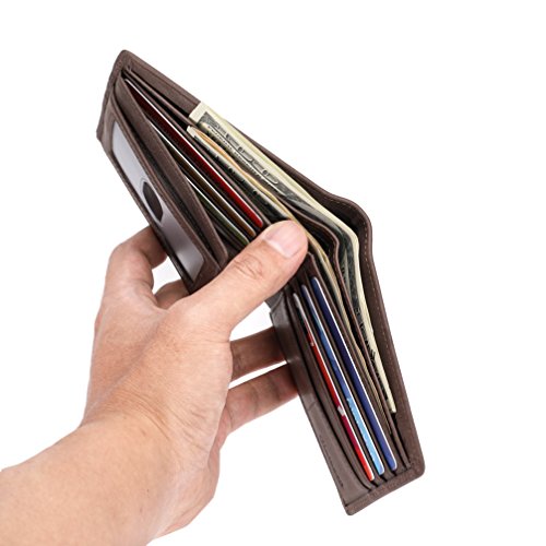 Features: - 100% Genuine leather - 2 ID window, 8 card slots, 2 hidden slots and 2 cash pockets - Size: L4.4 x W3.6 x H0.4 inches (11.2 x 9.2 x 1cm) - RFID signal blocking - Covered by our 2 years warranty What is RFID? - RFID: Radio-frequency identification, uses electromagnetic fields to automatically identify and track tags attached to objects. The tags contain electronically stored information. Our Credit/Bank/ID card, passport have encoded chips tags, and stored our personal/private information. So, we should protect them from information hacker and data thieves. - Data thieves can read your private data of cards at a distance of 10ft(3m), using a RFID scanner. Now, this RFID signal blocking wallet can protect your personal/private information safety. - This item has built-in RFID signal blocking material layers, which can block signal from 10MHz to 30GHz. Credit/Debit/ID card, driver license, passport use the frequency of 13.56MHz. It won't block signal from ID badge, some old hotel room cards or building access cards, which use a frequency of 125 kHz. TIP: - Due to the monitor and light difference, the color will be slightly different with the pictures. - Logo prints and package maybe a little different with pictures.