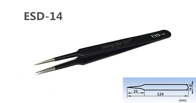 ESD-14(针尖型):此款镊子咀特尖细,咀边锋利,适用于高密度集成电路片的组件中操作。