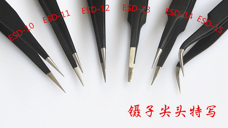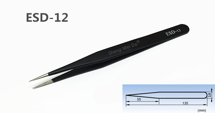ESD-12(高弹力):此镊咀比标准镊子更强大,而且在用强力夹电路板时镊不会弯曲,部件也 不会掉落。