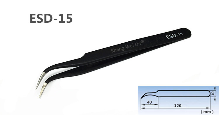 ESD-15(弯头型):此款镊子咀弯曲450°,适用于在狭窄处提取零部件。