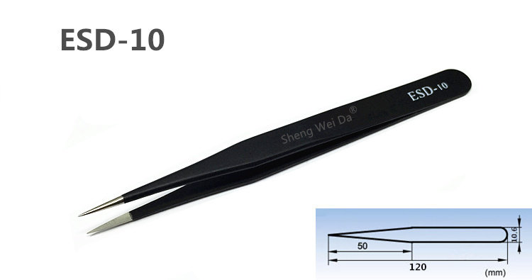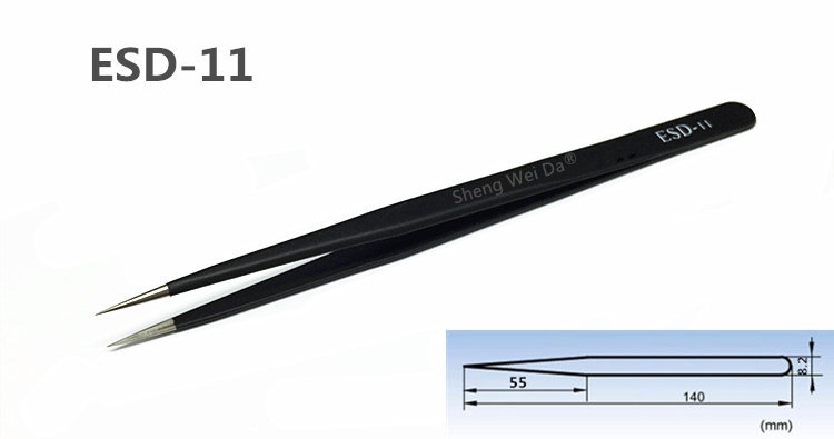 ESD-11(细长尖):此款镊子比标准型长度要长,适用于精密电子部件中操作。