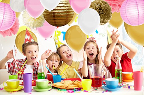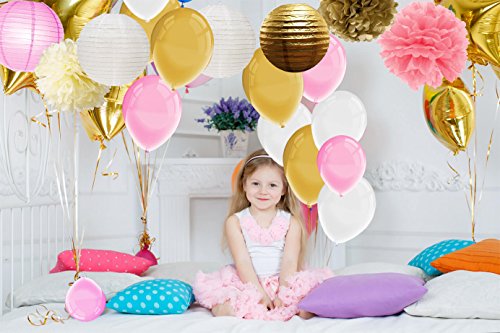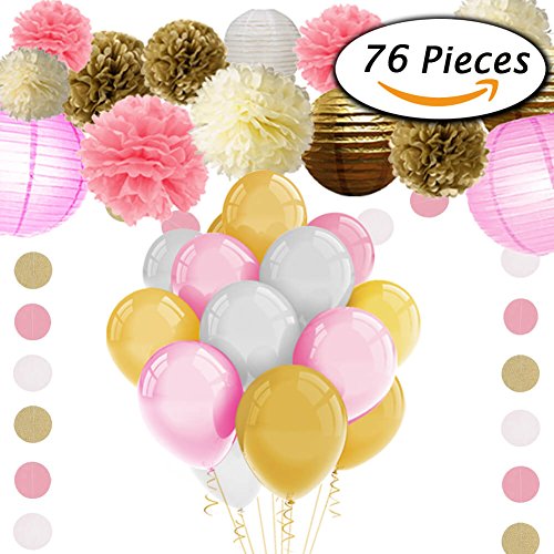 Paxcoo 76 Pcs Pink and Gold Tissue Paper Flowers Pom Poms Lanterns and Latex Party Balloons for Baby Shower Party Decoration