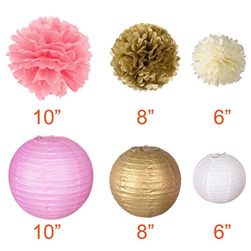 ASSORTED SIZES AND BRIGHT COLORS – Paper balls and lanterns are 6”, 8” and 10” in size and the balloons are 12” when blow up. All the hanging decorations are in pink, cream, white, gold glitter colors