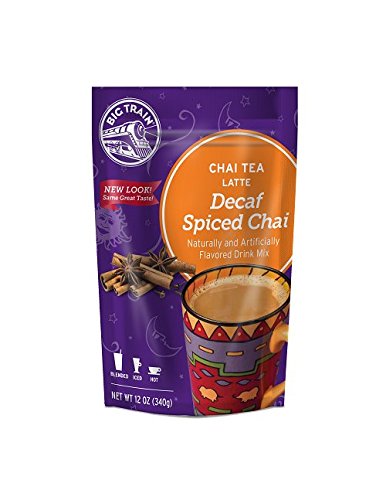 -. Binding : Grocery -. Brand : Big Train -. EAN : 0642628340054 -. Feature : Pack of three 12-ounce bags of decaffeinated spiced chai mix (36 total ounces) / A pre-mixed powder that makes 10 servings and requires no refrigeration / 99% caffeine-free drink can be served hot or cold to bring out the creamy blend of honey, vanilla and exotic spices / Simple to prepare: add a scoop to hot or cold water, stir and enjoy / Product of USA; Big Train is based in Foothill Ranch, California and distributes its drinks to coffee houses and retail outlets throughout the world -. Label : Big Train -. Manufacturer : Big Train -. Model : BT.540350 -. MPN : 540350 -. NumberOfItems : 3 -. PackageQuantity : 3 -. PartNumber : 540350 -. ProductGroup : Grocery -. ProductTypeName : GROCERY -. Publisher : Big Train -. Studio : Big Train -. Title : Big Train Spiced Decaf Chai, 12-Ounce Bags (Pack of 3) -. UPC : 642628340054