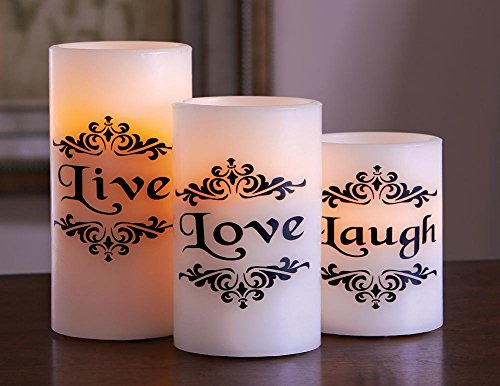 Studio : Collections Etc Publisher : Collections Etc Binding : Tools Home Improvement Product Description Led Live Love Laugh Candles - Set Of 3 Description With a sweet sentiment and a warm glow, these flameless candles will make a beautiful addition to your home. Set includes 3 white pillar candles in different heights. LED lights inside provide a realistic glow without the hazard of an open flame or mess from melting wax. Set req. 3 "AAA" batteries (sold separately). Plastic and paraffin. All candles are 3" Dia. and are 4", 5" and 6"H. About Collections Etc's Candles and Candleholders Collections Etc.'s can-do candles and decor light up your home with a warm glow and arresting aromas. We have floral candles, flameless candles, seasonal candles, holiday candles, and even candles that send out soothing sounds as they burn bright.
