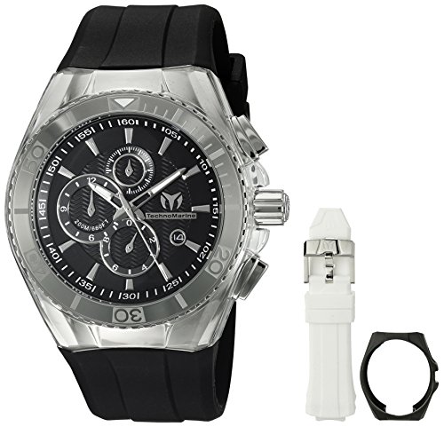 -. Binding : Watch -. Brand : TechnoMarine -. Department : mens -. EAN : 0886678978731 -. Feature : Chronograph functions with 60 second, 12 hour and 1/10 of a second subdials; date window at 4:00 / Black textured dial with silver tone and white hands and silver tone hour markers; luminous; unidirectional stainless steel bezel; screw-down crown; mineral crystal; stainless steel case with plastic transparent cover; black silicone strap; set includes: black plastic case cover and white silicone strap / Quartz Movement / Case Diameter: 47mm / Water Resistant To 660 Feet -. Label : Swiss Watch International -. Manufacturer : Swiss Watch International -. Model : TM-115042 -. MPN : TM-115042 -. PartNumber : TM-115042 -. ProductGroup : Watch -. ProductTypeName : WATCH -. Publisher : Swiss Watch International -. Studio : Swiss Watch International -. Title : Technomarine Men's TM-115042 Cruise Original Analog Display Quartz Black Watch -. UPC : 886678978731