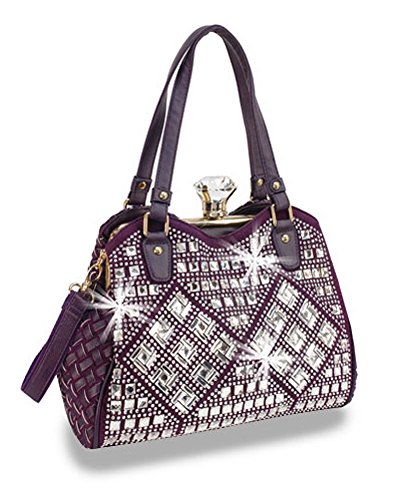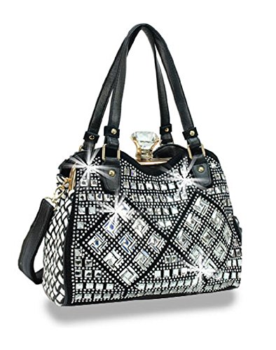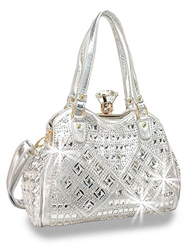 Product Description A retro-themed handbag with an over-sized sparkling gem clasp on the A-Frame closure. The entire front panel is covered in a gorgeous display of tiny rhinestones and both square and rectangular faceted mirrored tiles. Features dual carrying straps, 9in drop length, A-frame clasp closure, simulated leather construction, fully lined interior includes inside zippered pocket and cell phone pouch, gold toned hardware, metal stud feet, detachable shoulder strap with 21in adjustable drop length and measures approx. 14.5L x 9H x 5W. 0