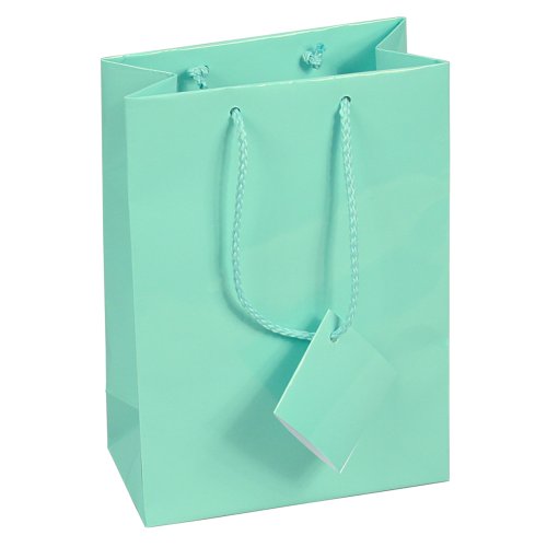 10 pcs Medium Fancy Robin's Egg Blue Glossy Finish Shopping Paper Gift Sales Tote Bags with Blank Message Tag 4.75" x 2.5" x 6.75"