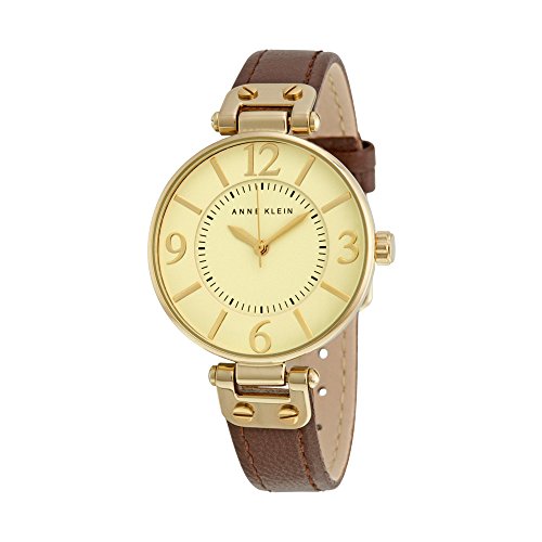 Amazon.com Crisp lines and a modern look define this Women's Gold-Tone Round Brown Leather Strap Watch from AK Anne Klein. The oversized, ivory dial features easy-to-read, gold-tone Arabic numbers at three, six, nine and 12 o'clock with baton indexes marking the remaining hours. A black printed minute track encircles the center of the dial while three gold-tone hands track the time. Unique, gold-tone metal plates with screw details accentuate the slim case and the soft, brown, calfskin leather strap. Designed for the contemporary woman, this chic timepiece will sparkle on your wrist for years to come. 0