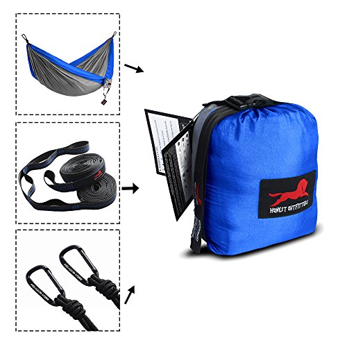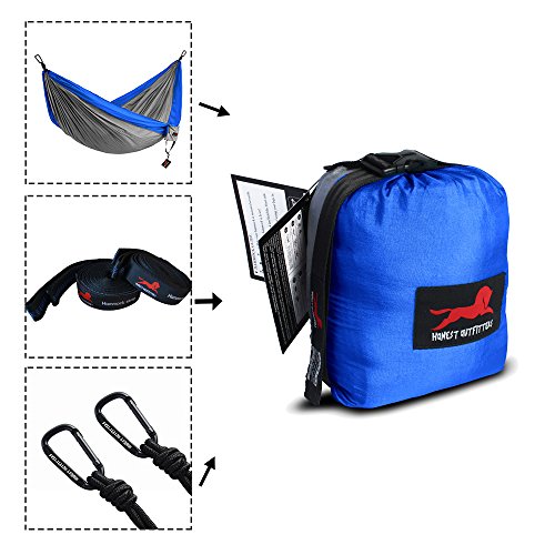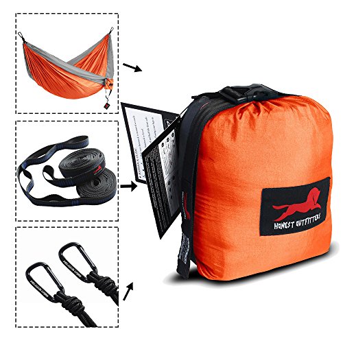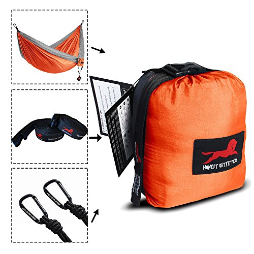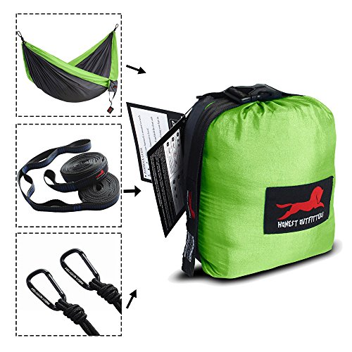 Honest Outfitters give you the best camping hammock. Compare to the other hammocks, our portable hammock is extremely SOFT and comfortable. - Good Quality The hammock is made of super strong 210T parachute nylon material. This soft, breathable and mildew-resistant nylon cloth will last for a long lifetime. We have employed high-grade nylon triple interlocked stitches to maximize hammock strength for your ultimate safety. So the hammock are tested to hold up to 400-500lbs(single hammock: 400lbs, double hammock 500lbs).