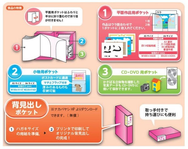 | 仕様 | 表紙厚み:約0.9mm 【ポケット】 平面作品用:四つ切画用紙・7ポケット・厚み約0.5mm 小物用:A5・2ポケット(1シート)・厚み約1.0mm CD/DVD用:8ポケット(2シート) 背ポケット:1ポケット 収納枚数:四つ切画用紙14枚(坪量:約180g/平方メートル程度・1ポケット2枚収納)・CD-R8枚 |