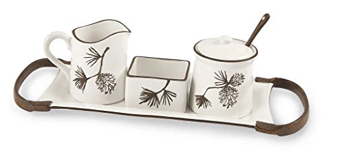 Product Description 5-piece set. Stoneware tray features faux-metal handles and comes with cream, sweetener packet and sugar holders with etched pine bough design. Comes with sugar spoon. 0