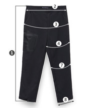 | 尺码 | ①裤长 | ②腰围 | ③臀围 | ④大腿围 | ⑤前裆 | ⑥后裆 | ⑦膝围 | ⑧脚围 | ||
