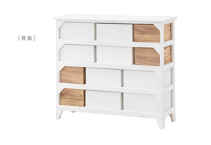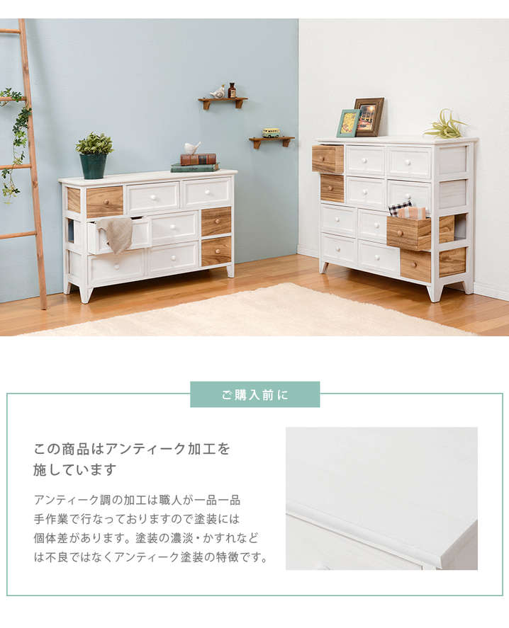 ●たっぷり収納できる、シンプルなアンティーク調チェスト。ブラウンの引出しがアクセント。
