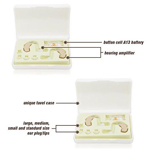 -. Feature : Includes (2) Hearing Amplifiers - Wireless & Compact Ear Design - Adjustable Volume Control / Effectively Reduces Background Noise - Noise-Cancelling & Voice Clarifying Technology / Tested to Provide a More Comfortable Listening Experience - Universal Size Fits All Ear Shapes & Sizes / ASC (Automatic Signal Control) Regulates & Balances Sound - Comes with (3) Different Sized Ear Plugs / Tips / Battery Operated: Requires (1) Button Cell A13 (LR44) Battery, Each - Includes Travel Case & Batteries