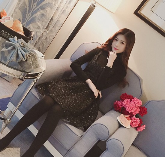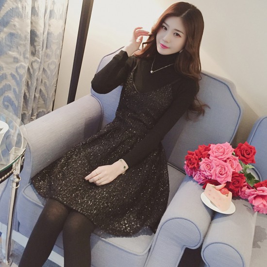 ハイネックのニットと膝上丈のワンピースのセットアップです。