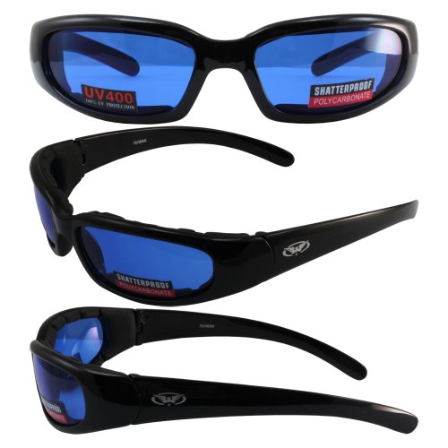 -. Title : Chicago Foam Padded Sunglasses SHINY Black Frame Motorcycle Goggles Various Lens Options Chicago Lens Color: Blue Lenses