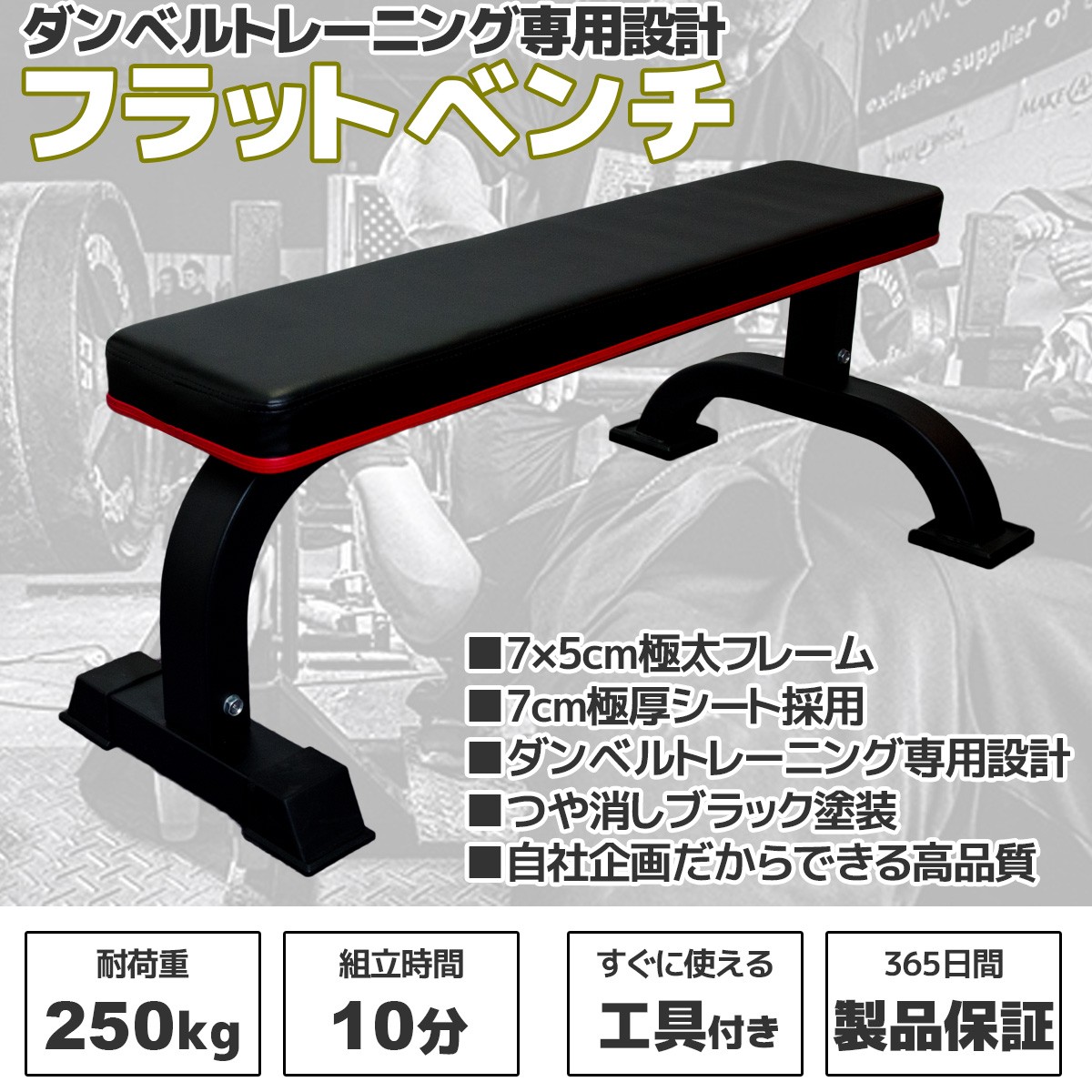 ダンベル運動専用設計 耐荷重250kg フラットベンチ