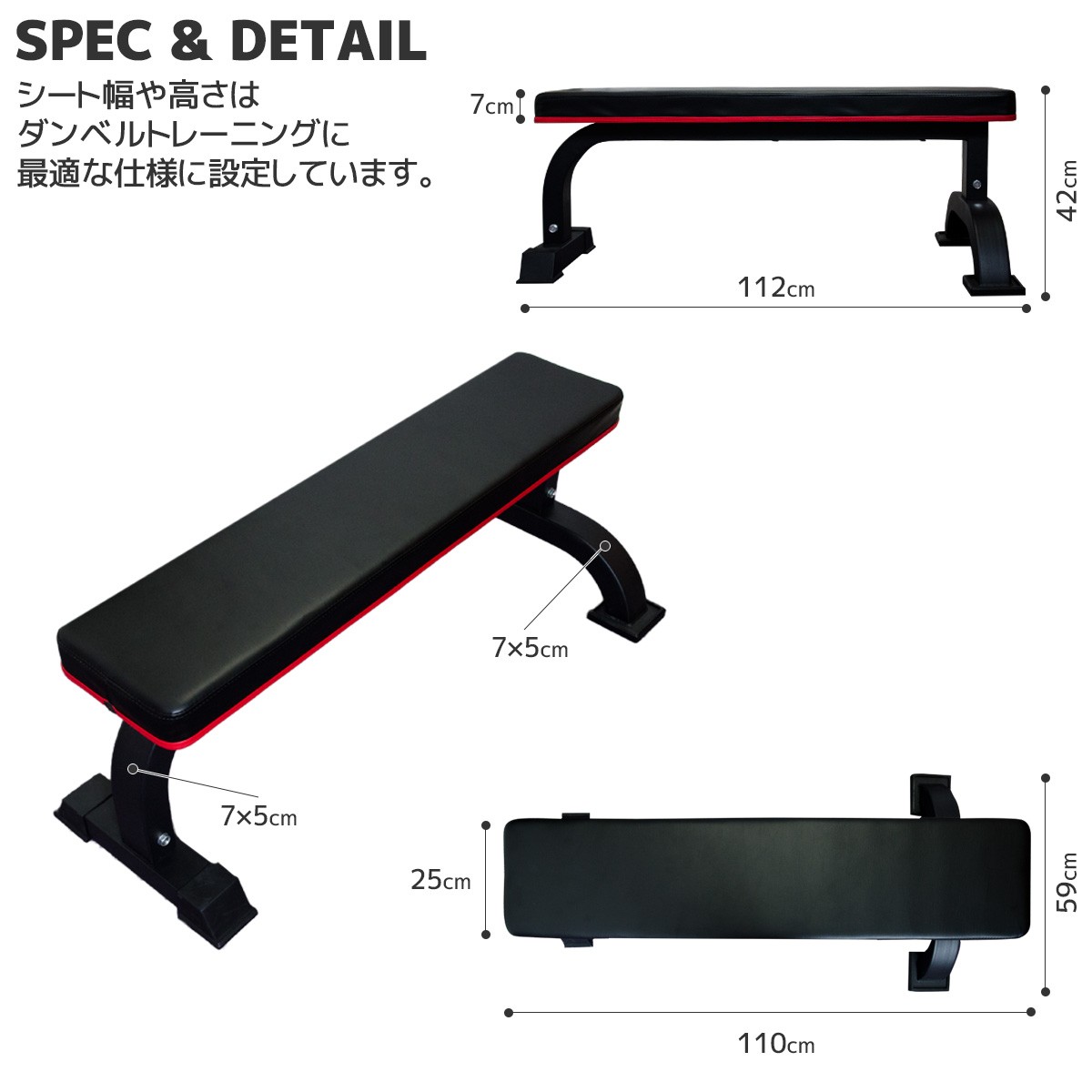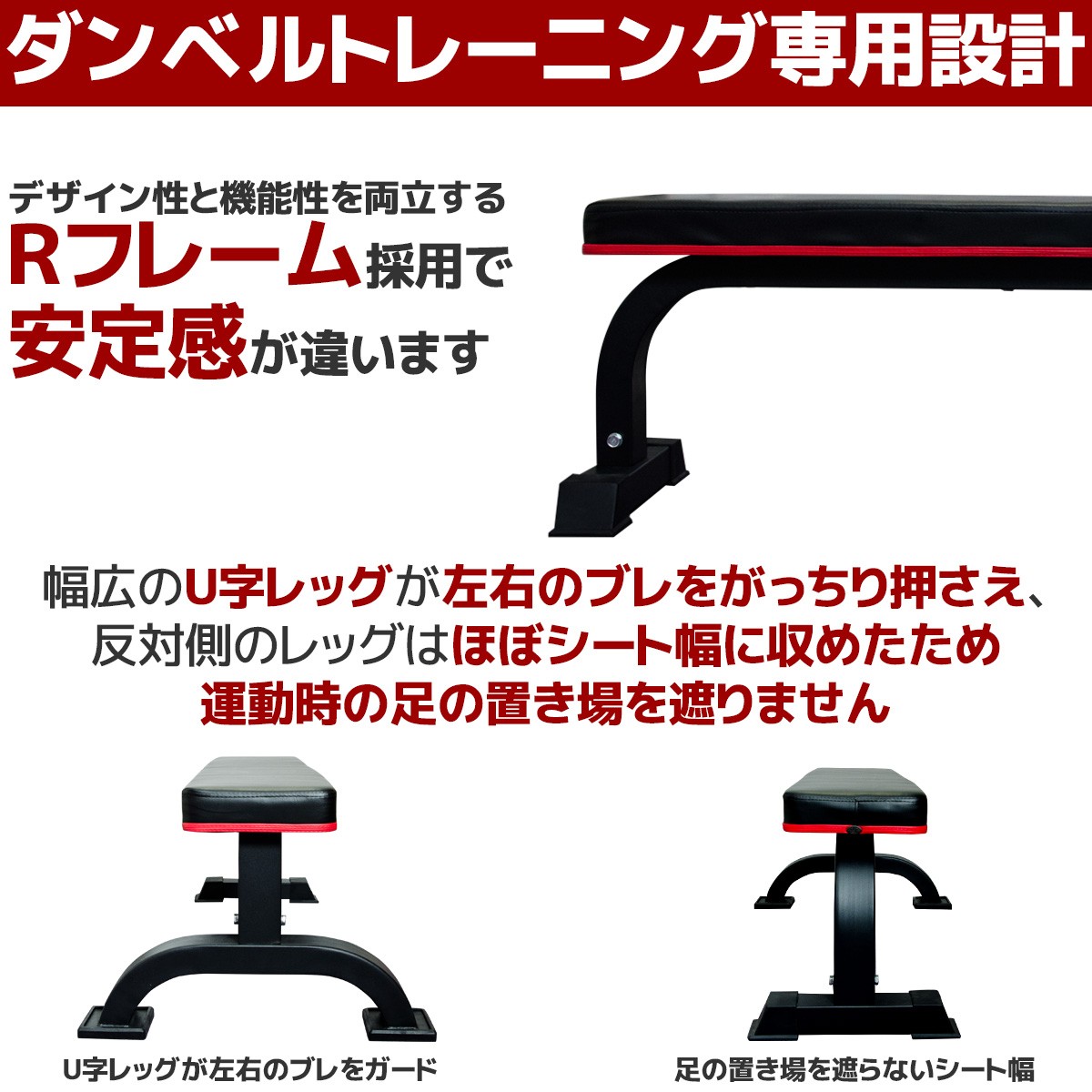 ■7cm極厚シート 7cmの厚みがある硬めのクッションで腕や背中をしっかり保護します ■ダンベルトレーニング専用設計 デザイン性と機能性を両立するRフレーム採用で安定感が違います 幅広のU字レッグが左右のブレをがっちり押さえ、反対側のレッグはほぼシート幅に収めたため運動時の足の置き場を遮りません