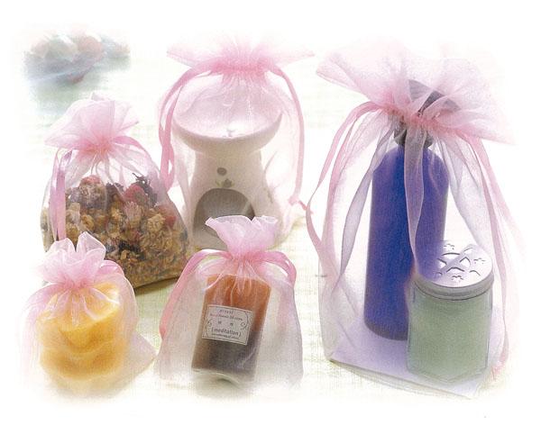 オーガンジーでできた優しい風合いのポーチです。ボトル等のいびつな形の物も簡単に可愛くラッピングできます。
