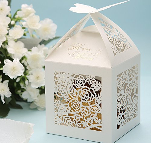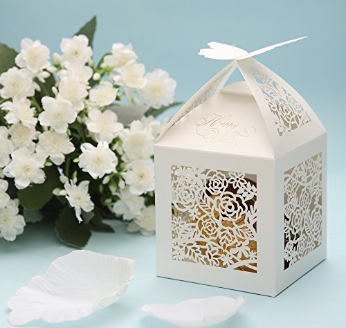 Krismile® 50 Pack White Elegant Butterfly Top Laser Cut Rosette Rose Candy Favor Box Bridal Shower Gift Boxes Wedding Party Decoration
