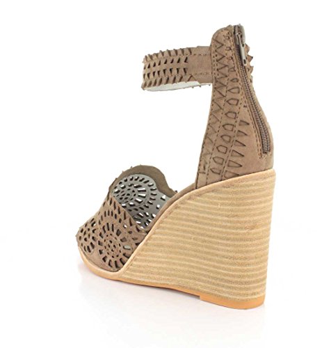 Product DescriptionAnkle strap wedge sandals with laser cut detail.0