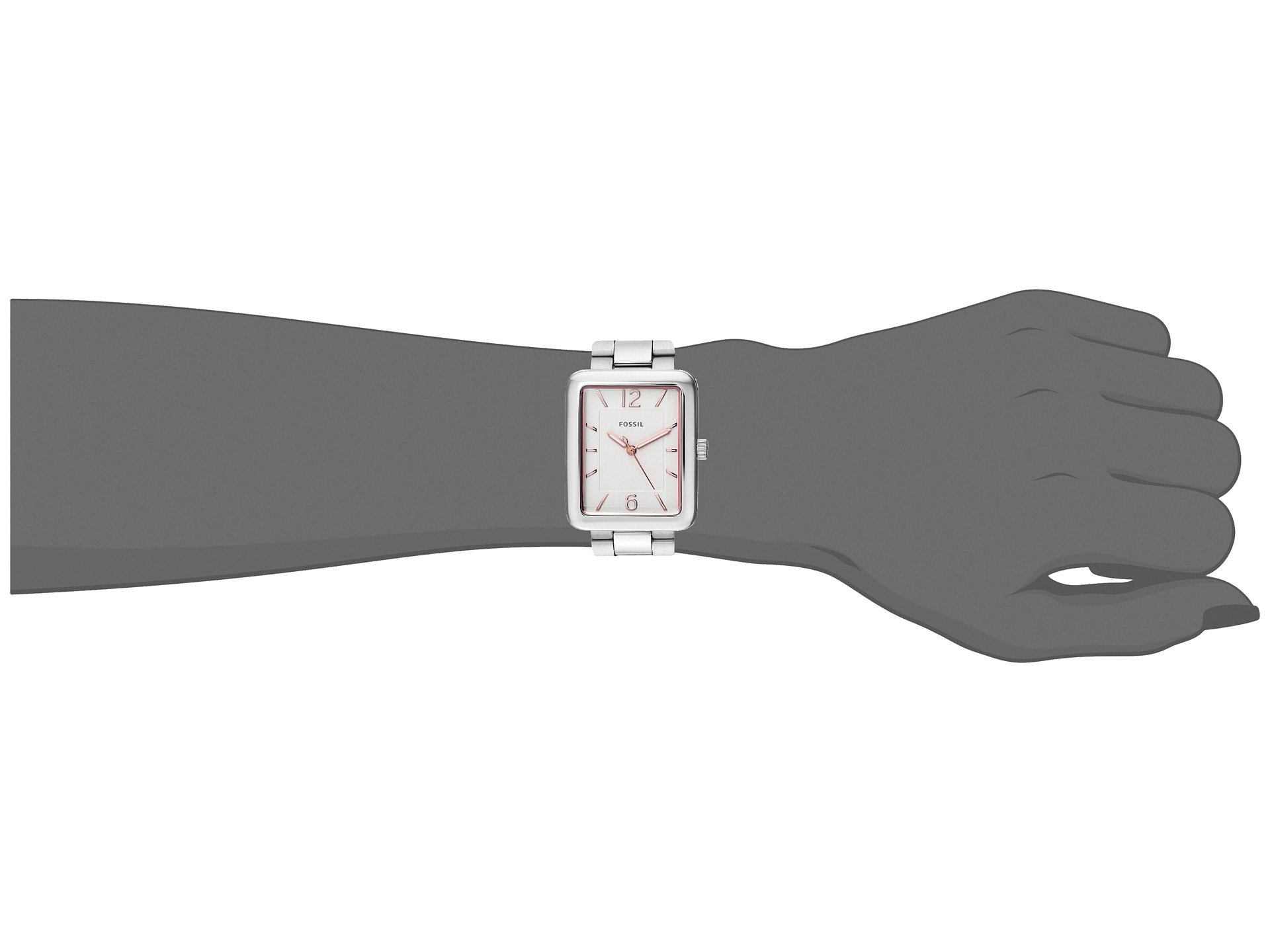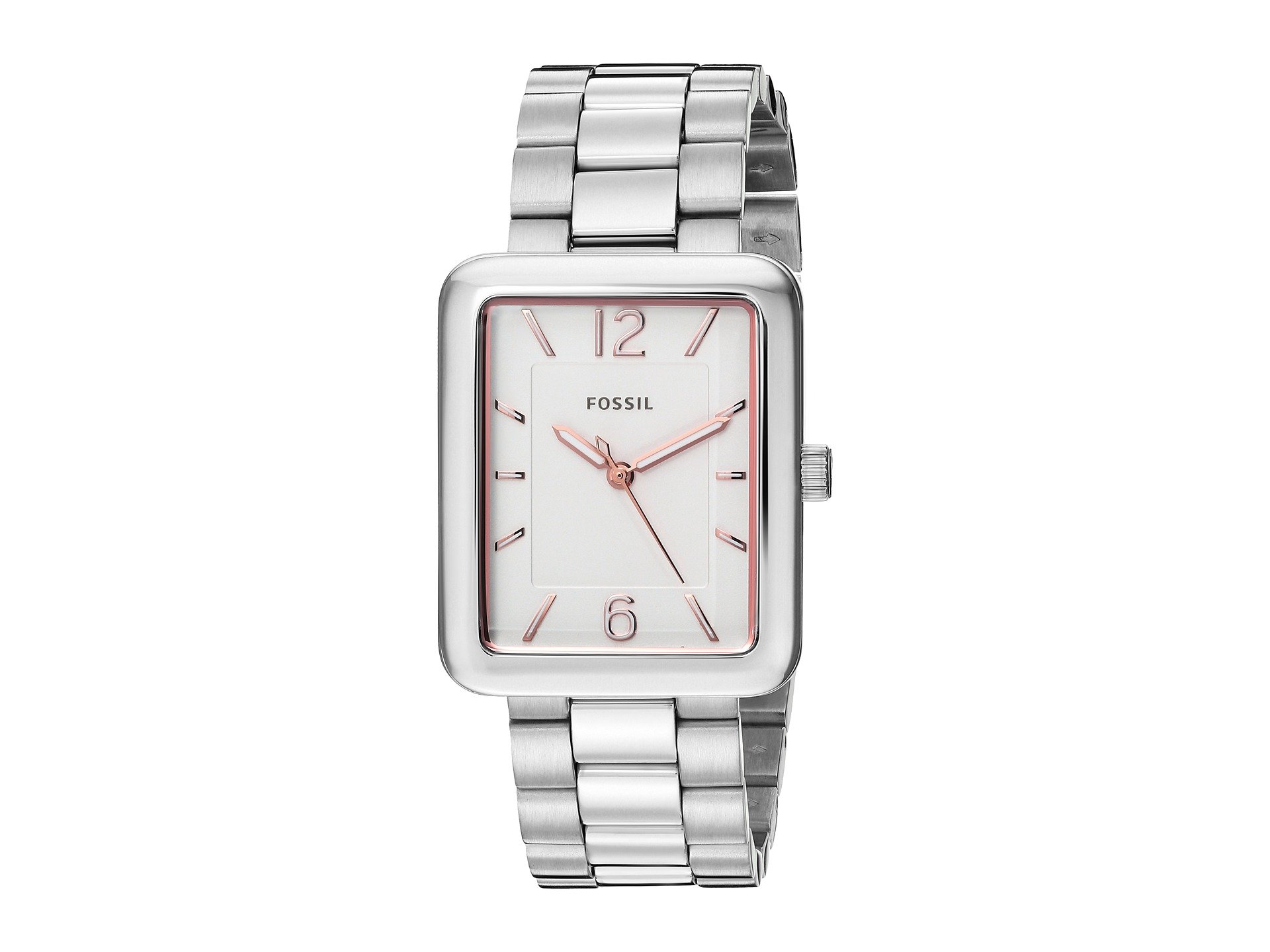 | Product Information SKU: #8887395Keep your look pristine with this watch from Fossil?!Stainless steel case.Stainless steel bracelet with fold-over, double push-button release. Tank face.Three-hand analog display with quartz movement.White dial features rose gold-tone hands, hour markers, and Fossil detailing.Water resistant 5 ATM.Display case included.Imported.This product may have a manufacturer's warranty. Please visit the manufacturer's website or contact us at warranty@support.zappos.com for full manufacturer warranty details.Measurements: Case Height: 28 mm Case Width: 28 mm Case Depth: 8 mm Band Width: 17 7?9 mm Band Circumference/Length: 8 1?4 in Weight: 3.4 oz |