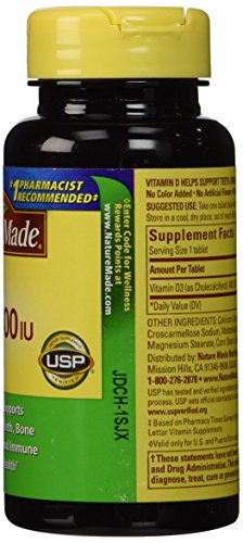 -. Binding : Health and Beauty -. Brand : Nature Made -. Feature : Promotes the strength of your immune system / Supports bone and joint health / No artificial flavors -. Label : Nature Made -. Manufacturer : Nature Made -. MPN : 1688 -. PartNumber : 1688 -. ProductGroup : Health and Beauty -. ProductTypeName : HEALTH_PERSONAL_CARE -. Publisher : Nature Made -. Studio : Nature Made -. Title : Nature Made Vitamin D 400 IU 100 Count Tablets