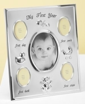 -. Feature : Silver frame with 5 photo displays; 1 large, 4 small: First Day, First Smile, First Bath, First Steps