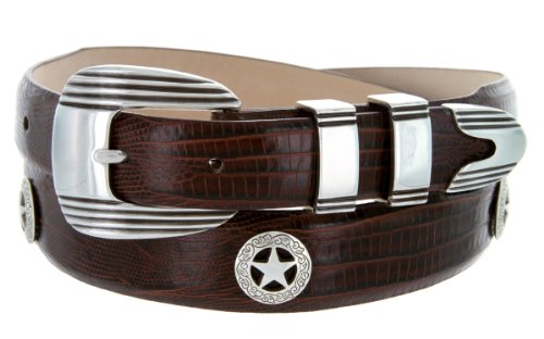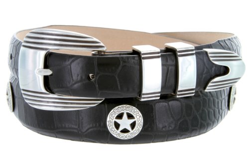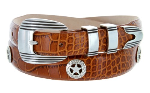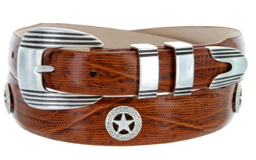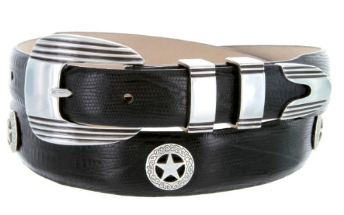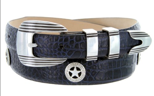Product Description Stand out on the course with this handsome Men's golf belt. Constructed from high quality Italian Calfskin and lined with supple genuine leather on the back. This belt features an eye catching 4-piece designer buckle set, finished in antique silver. Matching western ranger star concho ornaments complete the sporty yet dressy look. Available in a wide range of strap styles and colors. 0